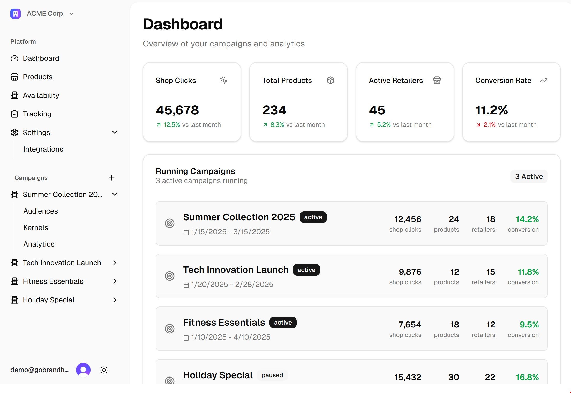 Launch optimized landing pages for ads, influencer campaigns, and email marketing in seconds with dynamic retailer options.